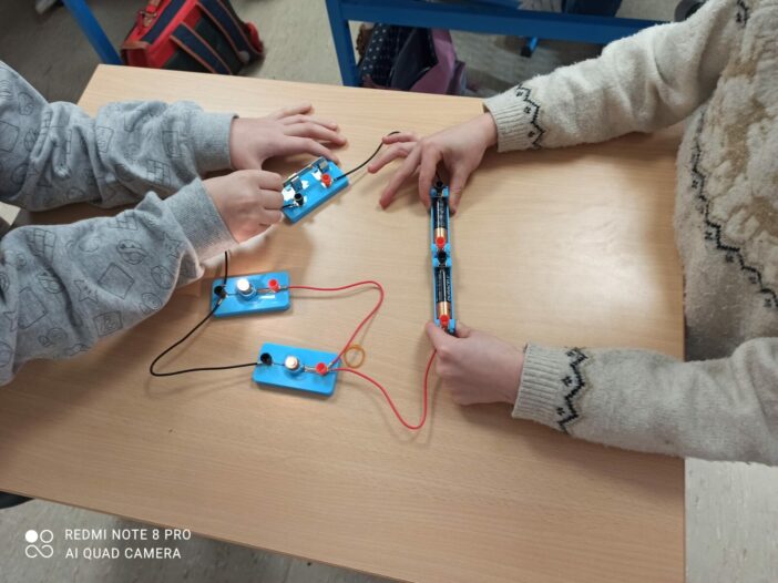 Au début, nous avons réalisé que certains appareils fonctionnaient grâce au courant électrique du secteur (comme l’ordinateur, la lampe ou le réfrigérateur…) et d’autres par des piles électriques (comme la lampe de poche, la télécommande ou l’horloge murale de la classe…). Ensuite, nous nous sommes intéressés aux dangers de l’électricité : attention notamment à ne pas […]